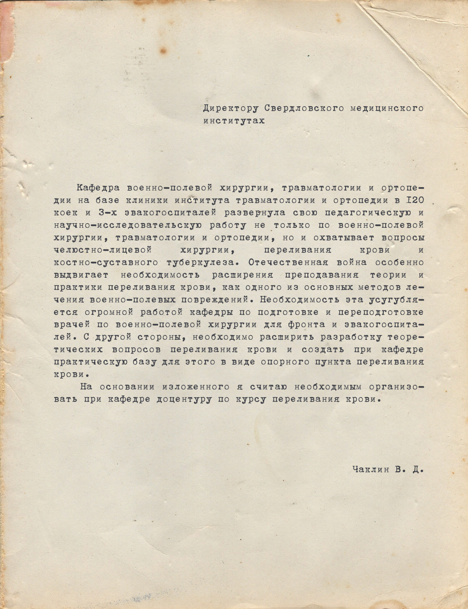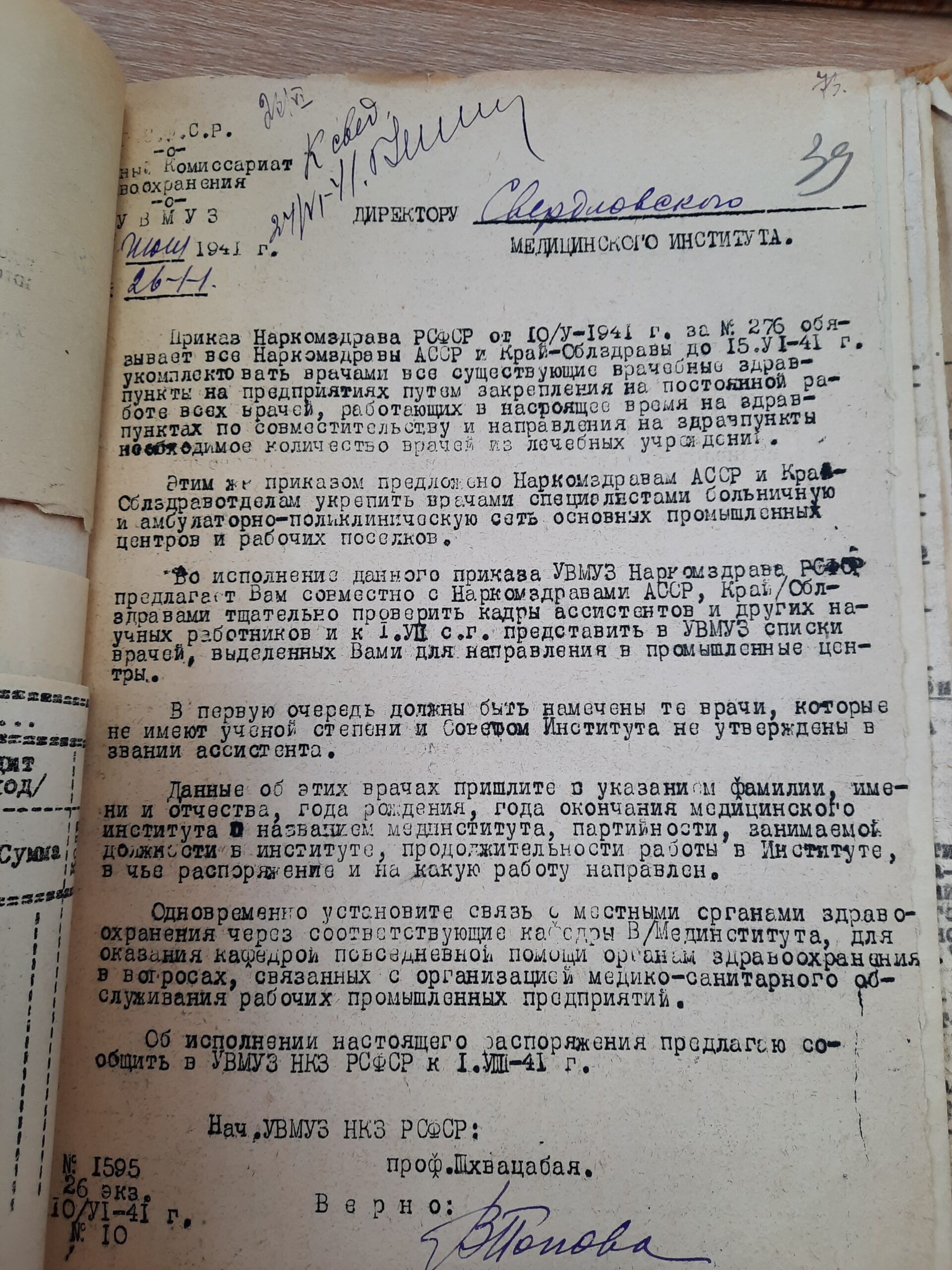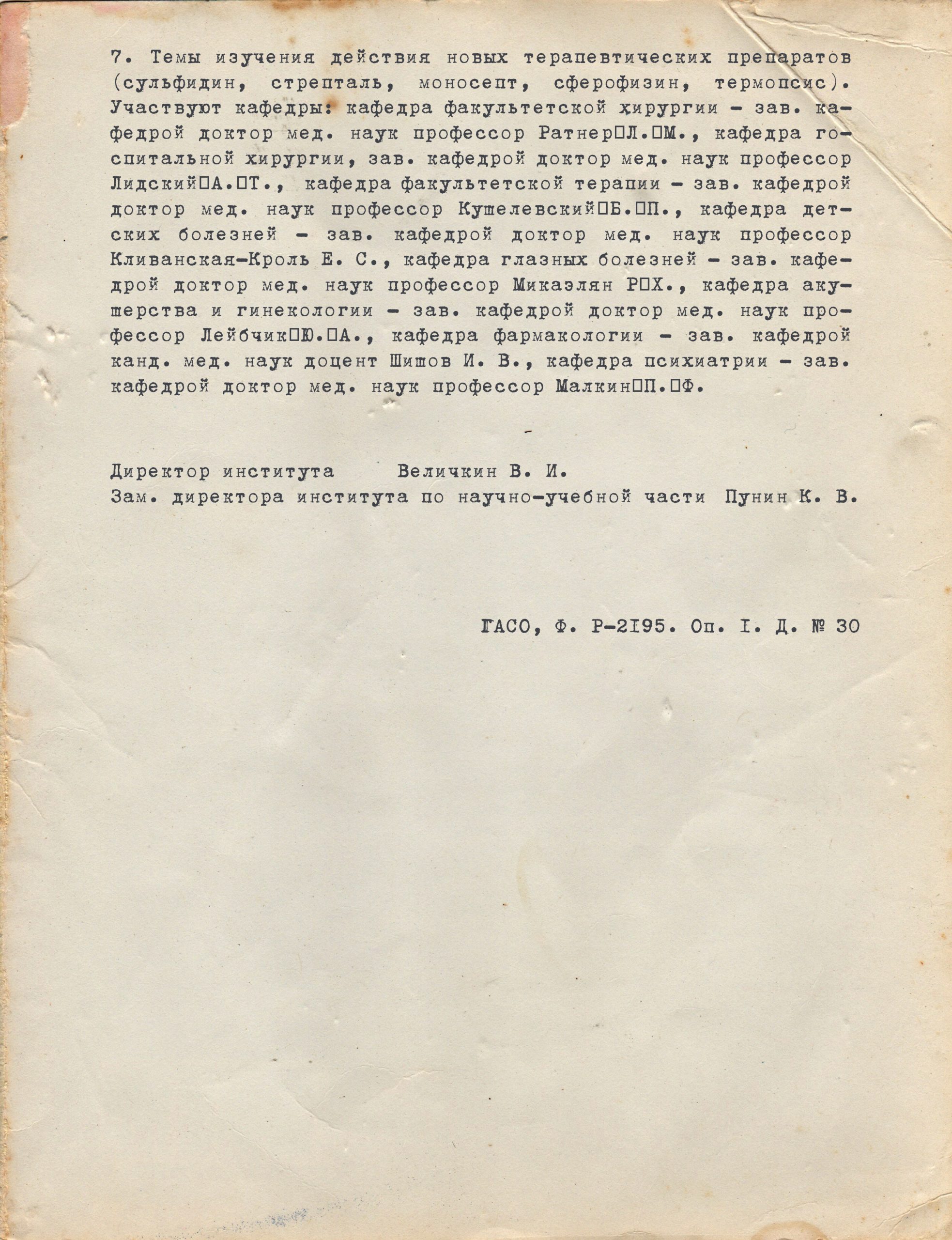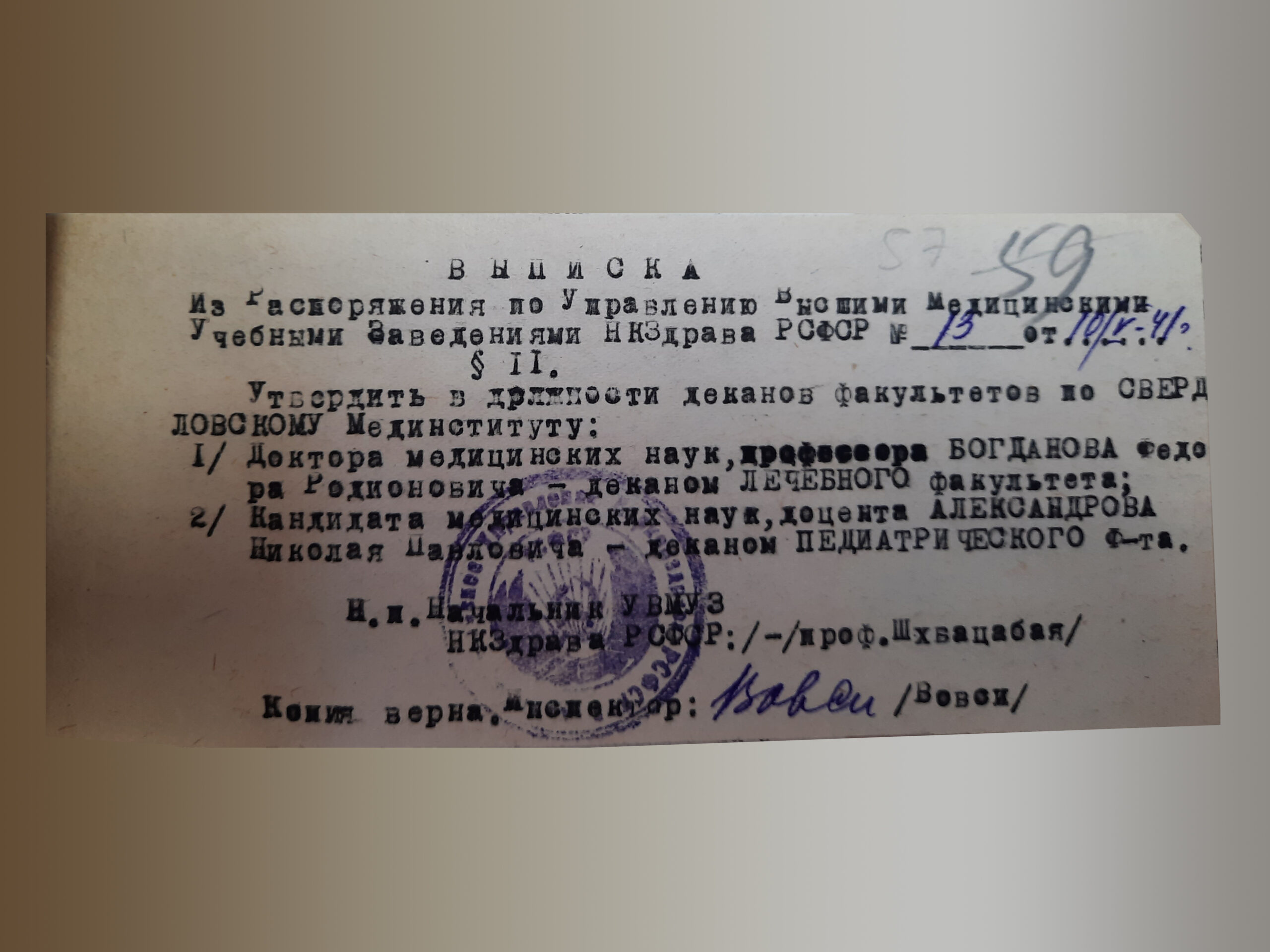 В 1941 году директором Свердловского Медицинского института был Величкин Владимир Иванович.