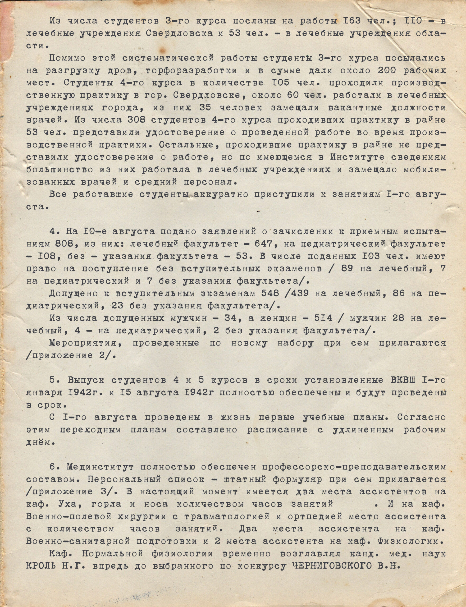- Из очередных задач по приему, которые мединститут считает необходимым провести в ближайший период времени будут: 1) ремонт общежитий и столовой, 2) ремонт помещений для приемной комиссии…, 3) установление дежурств на вокзале для встречи приезжающих на испытания, 4) поручить отъезжающим студентам I, II, IV курсов установить связь с выпускниками средних школ и провести беседы о задачах медицинского образования и о роли врача в жизни страны, 5) проводить культурно-массовые мероприятия среди абитуриентов, сдавших экзамены.