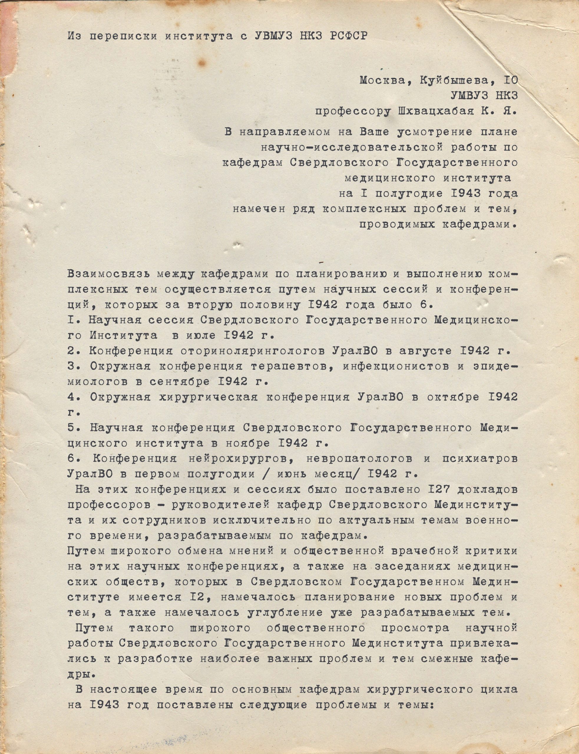 В 1941 году Свердловскому медицинскому институту исполнилось 10 лет. К этому времени он вырос в крупное учебное заведение, создал прочную материальную базу, имел коллектив высококвалифицированных профессоров и преподавателей. Наметились перспективы дальнейшего развития вуза, но их отодвинула Великая Отечественная война. Экстремальные условия военного времени потребовали в кратчайший срок коренным образом перестроить всю работу коллектива института, подчинить ее главной цели: «все для фронта, все для победы». Организация работы вуза в военное время проводилась под руководством его директора, профессора В. И. Величкина (1941— 1946 гг.). Прежде всего предстояло оперативно наладить ускоренный выпуск врачей для фронта. В 1941— 1942 гг. занятия в институте с августа начались по новым учебным планам. Пятилетний курс бучения предполагалось закончить в течение 3,5 лет за счет 8-часового рабочего дня и сокращения каникул, но при выполнении полного объема учебных программ. 26 августа 1941 г. Всесоюзный комитет высшей школы при Совете народных комиссаров СССР высылает телеграмму о необходимости реализации основного и переходного учебных планов на 1941-1942 гг., а в августе 1941 г. В. И. Величкин на запрос из Главного управления медицинских учебных заведений (ГУМУЗ) НКЗ СССР сообщает, что по новому учебному плану на IV и V курсах лекции и практические занятия проводятся в 2 смены. Сообщаются сведения о приеме на 1 курс, о распределении студентов по курсам, о количестве ординаторов и аспирантов, о наличии учебников. Уже в сентябре 1941 г. в институте состоялся ускоренный выпуск 92-х врачей, которые сразу были направлены на фронт. А в декабре 1941 г. проведен второй досрочный выпуск, давший стране еще 360 врачей. 65 выпускников института были оставлены на специализацию по хирургии.