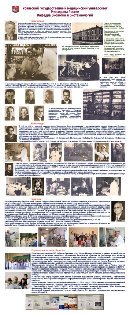 Кафедра медицинской биологии и генетики показала путь в медицину и науку выпускникам УГМА: Т.Б. Третьяковой (в настоящее время старший научный сотрудник, зав. отделом генетических исследований ФГУ НИИ ОММ Росмедтехнологий), Е.О. Шамшуриной (доцент кафедры физиологии человека и животных Уральского государственного университета им. А.М. Горького), Е.М. Гагариной (доцент кафедры нормальной физиологии УГМА).
