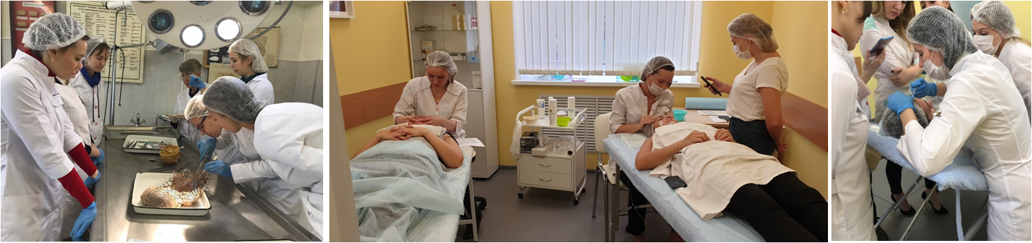 Обучающиеся участвуют в консилиумах сложных диагностических и лечебных ситуаций совместно с пластическими хирургами. На дисциплине «Неотложная медицинская помощь в косметологии» осуществляется отработка практических навыков в Мультипрофильном аккредитационно-симуляционном центре. Клинические практические занятия включают отработку мануальных навыков лазерной эпиляции, чрескожной лазерной коагуляции сосудов, коррекции пигментных поражений и татуировочной пигментации, удаление доброкачественных образований кожи, фракционного лазерного омоложения.