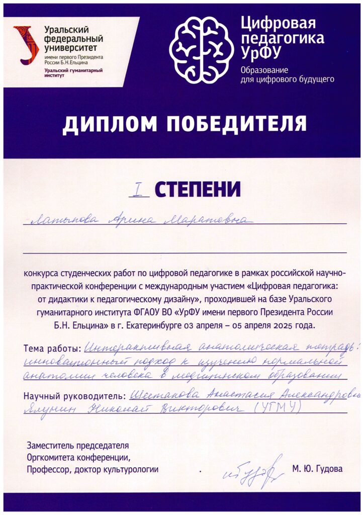 приняли участие в конкурсе научных работ молодых ученых, представив исследование по эффективности использования цифровых форматов в обучении анатомии. В рамках доклада был проведен анализ выполнения заданий по модулю «Пищеварительные железы» с использованием собственной разработки — интерактивной анатомической тетради.