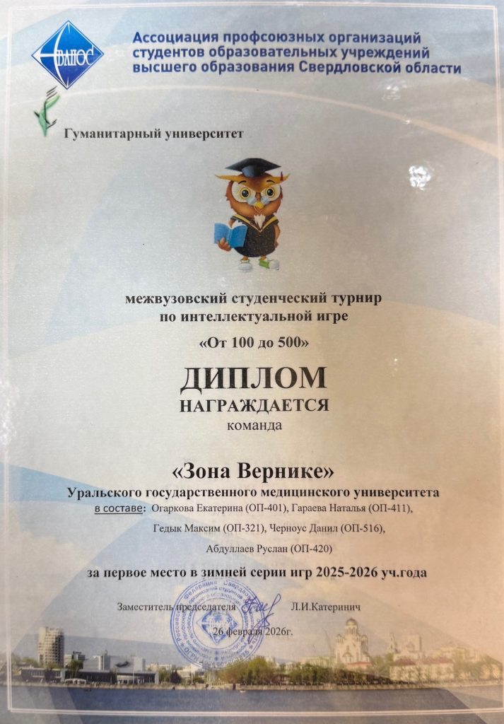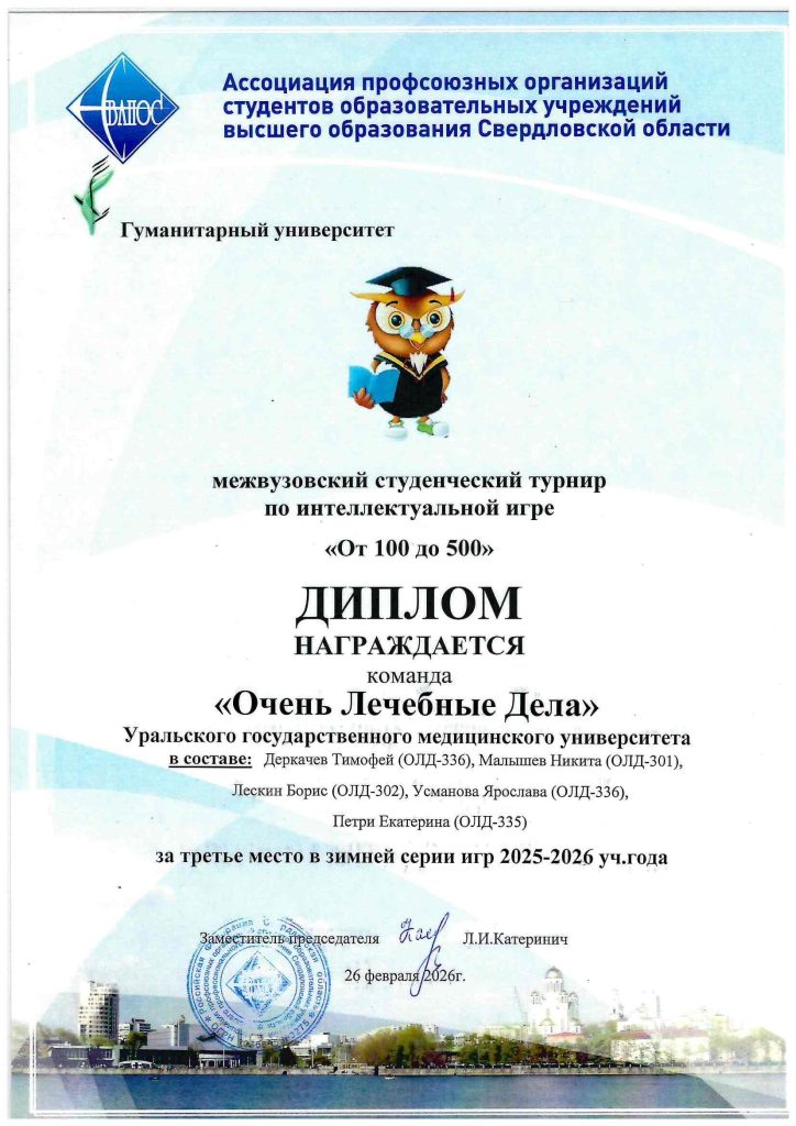 На межвузовском турнире по интеллектуальной игре «От 100 до 500», проводящимся Гуманитарным университетом совместно с Ассоциацией профсоюзных организаций студентов вузов Свердловской области (СвАПОС) команды УГМУ вновь стали победителями, завоевав почетные места!