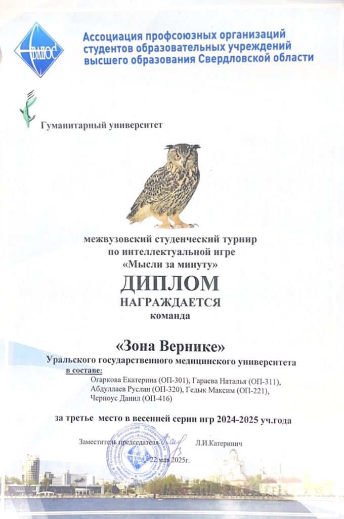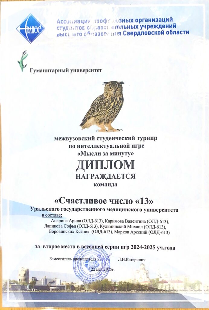 Серия межвузовских интеллектуальных турниров 2024-2025 учебного года завершилась 31-м турниром по интеллектуальной игре «Мысли за минуту», организованного Ассоциацией профсоюзных организаций студентов вузов Свердловской области (СвАПОС) совместно с Гуманитарным университетом. Команды нашего университета традиционно приняли участие и завоевали призовые места.