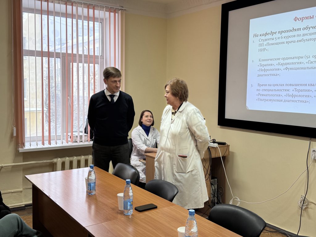 Ключевой целью визита стало живое общение с коллективом. Ректор Юрий Семёнов дал высокую оценку уровню учебной и научной работы, отметив эффективность интеграции кафедр в клиническую среду: