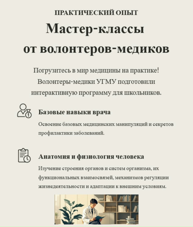Особой частью программы станут тематические мастер-классы от штаба «Волонтерымедики» УГМУ, направленные на практическое знакомство с профессией врача. Участники смогут погрузиться в основы медицины, узнать больше о базовых врачебных навыках, анатомии и физиологии человека.