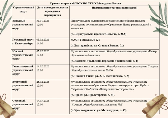 Выездные профориентационные встречи запланированы также в других управленческих округах Свердловской области. График мероприятий представлен в информационных материалах.