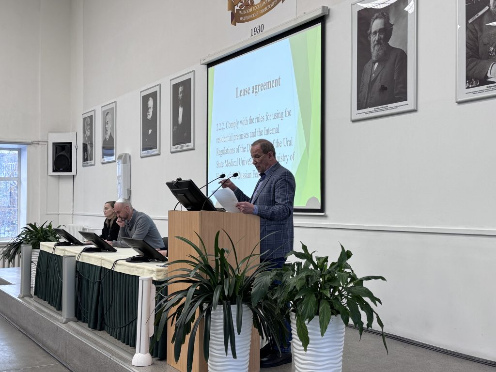 Мероприятие открыл первый проректор УГМУ Евгений Ванин, выразивший искреннюю признательность иностранным студентам за выбор Уральского ГМУ. Евгений Юрьевич акцентировал внимание собравшихся на важности строго следовать правилам и требованиям российского законодательства, внутренним нормам и актам, направленным на обеспечение порядка и комфорта жизни и учебы студентов.