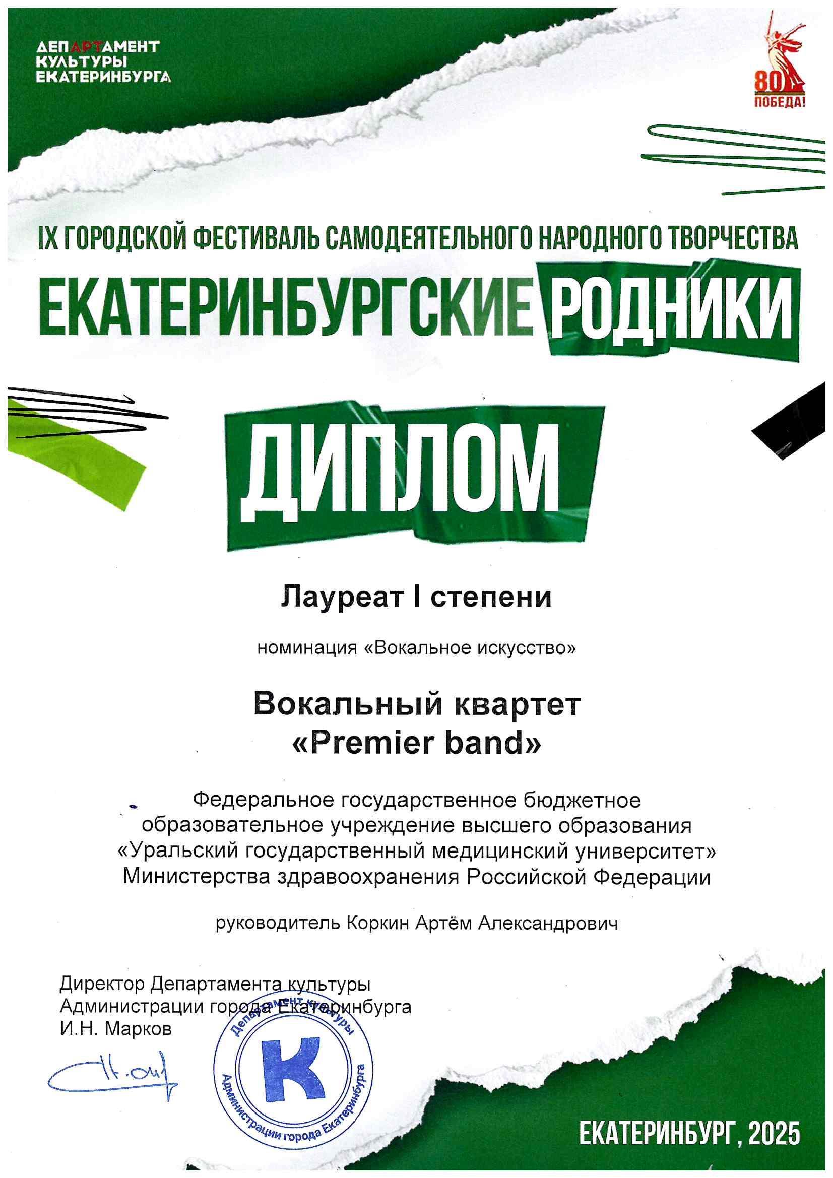 Вокальный ансамбль «Premier band» УГМУ стал Лауреатом I степени IX городского фестиваля «Екатеринбургские родники» 2025.