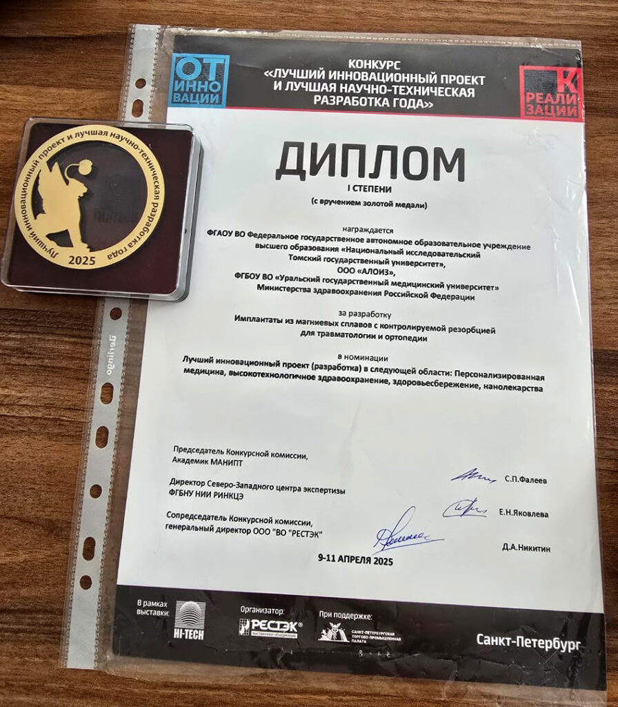 Ученые Уральского государственного медицинского университета, Томского государственного университета и компании «АЛОИЗ» представили на международной выставке Hi-Tech-2025 инновационный медицинский имплантат, созданный из магний-кальций-цинкового сплава с контролируемой скоростью рассасывания. Эта разработка, способная изменить подход к лечению переломов, победила в конкурсе «Лучший инновационный проект года» в номинации «Персонализированная медицина и высокотехнологичное здравоохранение» на одной из крупнейших выставок в сфере технологий и инвестиций Hi-Tech-2025. Проект получил высокую оценку экспертного жюри.