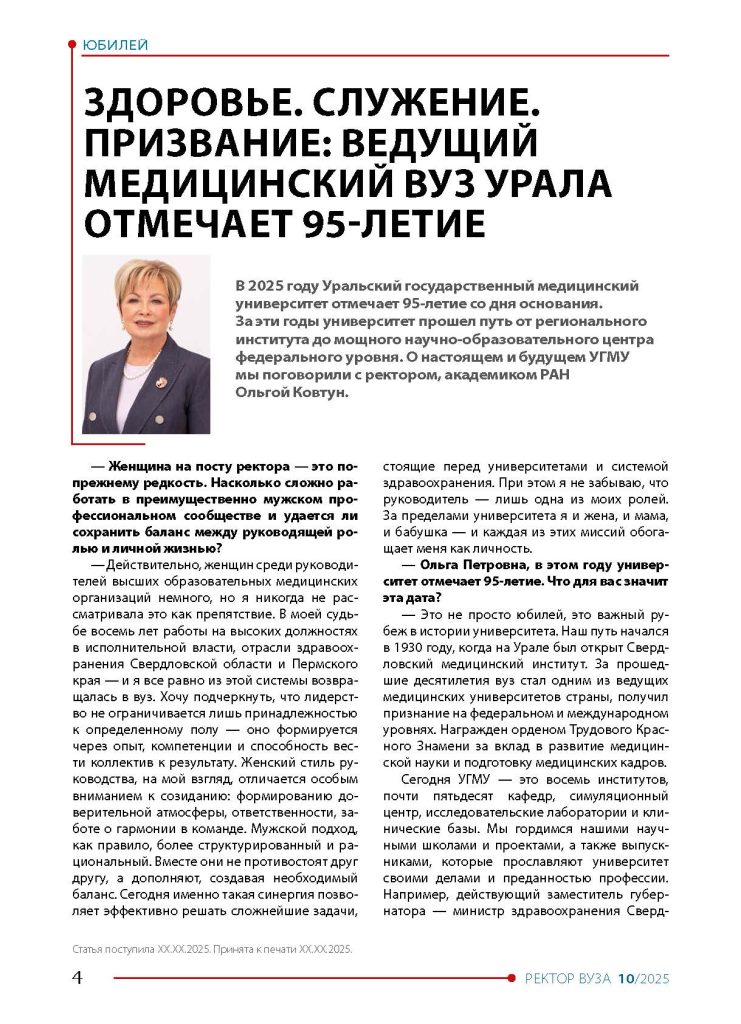 В октябрьском номере федерального специализированного журнала «Ректор вуза» (№ 10, 2025) вышел материал, посвященный ректору Уральского государственного медицинского университета, академику РАН Ольге Ковтун.